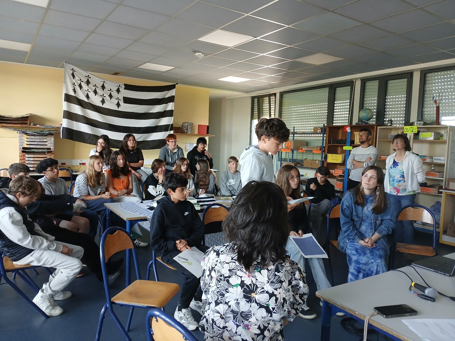 Quel peut donc bien être le lien entre Saint-Méen-le-Grand et le village de Cârtà, situé en Transylvanie, au cœur de la Roumanie ? C’est la question que Marie Guérin, documentariste sonore pour Radio France a posée aux élèves de 4eC. Marie Guérin a effectué plusieurs déplacements et reportages en Roumanie, elle s’intéresse au collectage des contes et légendes de tradition orale, à ces histoires qui se racontaient le soir à la veillée, et qui se sont transmises de bouche à oreille, de génération en génération, jusqu’à nous parvenir. Et c’est ce à quoi elle a voulu sensibiliser les élèves, en les amenant à devenir à leur tour des collecteurs, des reporters radio. L’objectif était de prendre contact avec des collégiens de Cârtà, pour échanger sur les traditions des deux régions riches en légendes que sont la Bretagne et la Transylvanie. Les élèves ont pleinement joué le jeu : d’abord en réalisant un micro-trottoir dans les rues de St-Méen, puis auprès de leurs proches, ils ont collecté et enregistré des récits, des sons, des moments de vie. Marie Guérin a sélectionné quelques fragments parmi la somme des témoignages recueillis et a réalisé un montage. Les élèves ont ensuite réalisé des cartes postales grand format pour se présenter. Ce travail a été mené en arts plastiques et en français. Enfin, une rencontre en visio avec les collégiens de Cârtà a été organisée le 17 juin, une heure au cours de laquelle nos élèves ont pu présenter leur travail aux collégiens roumains et à leur professeure de français. Vous pouvez d’ailleurs vous aussi écouter le montage réalisé par Marie Guérin. Nous tenons à remercier très chaleureusement la MJC La Paillette de Rennes, et tout particulièrement Marthe Bouillaguet, sans laquelle ce projet n’aurait pas pu voir le jour, ainsi que Iulia Filip qui a assuré la traduction et permis les échanges. Un grand merci également à Marie Guérin qui a partagé avec nous sa passion du reportage radio et de la Roumanie, une belle rencontre pour les élèves !