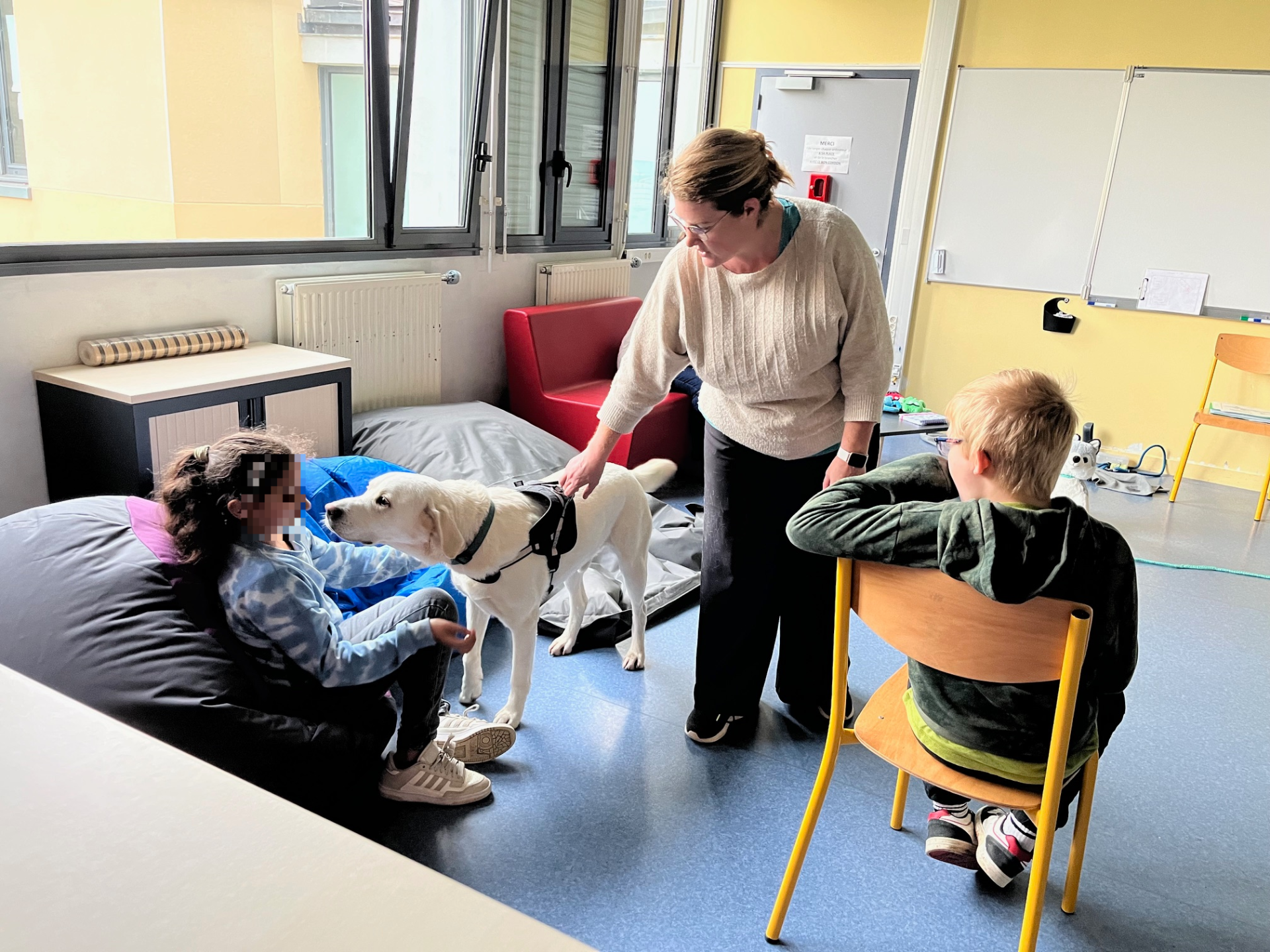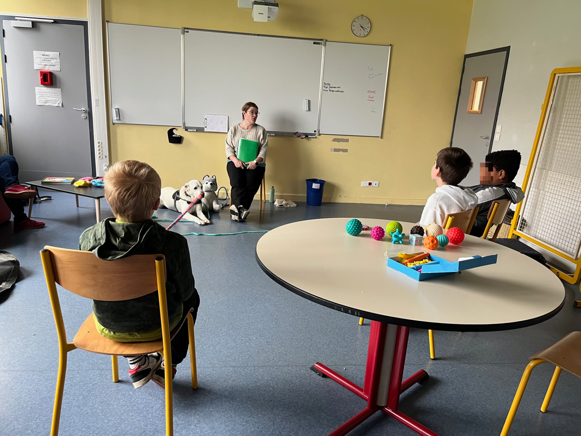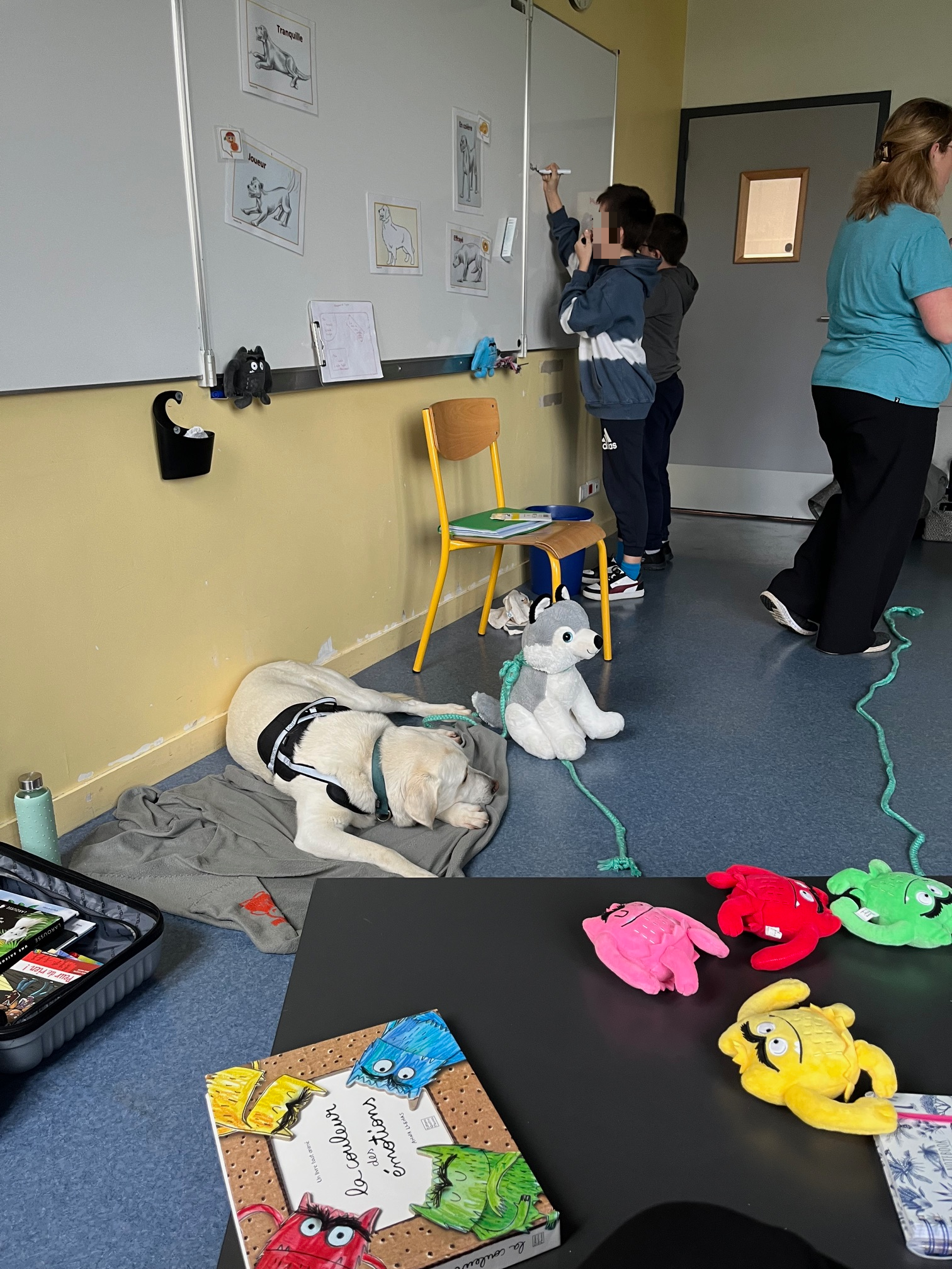 Léandro D.O. et Gwendal L. B. qui ont chacun des animaux de compagnie chez eux (poules, chats, chiens et oiseaux) ont apprécié ce moment en compagnie de Rocky et de sa maitresse Madame Collet Léandro a souligné « la douceur et la gentillesse » de Rocky.