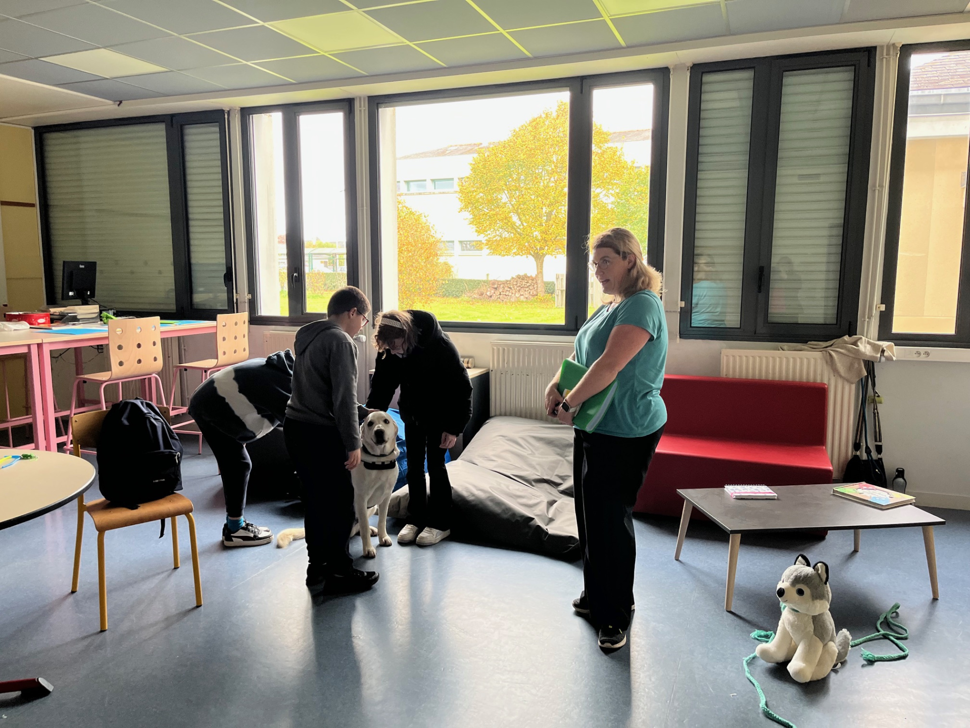 Dans le cadre du dispositif de “médiation animale” mis en place au collège depuis la rentrée des vacances d’automne, 11 élèves scolarisés en classe de 6e, ont fait la connaissance de Rocky . Le labrador, habitué à évoluer avec des enfants semble avoir fait l’unanimité auprès de nos élèves : à voir leurs sourires à la fin de la séance et entendre leurs commentaires enflammés on ne peut douter de la réussite de ce nouveau dispositif.